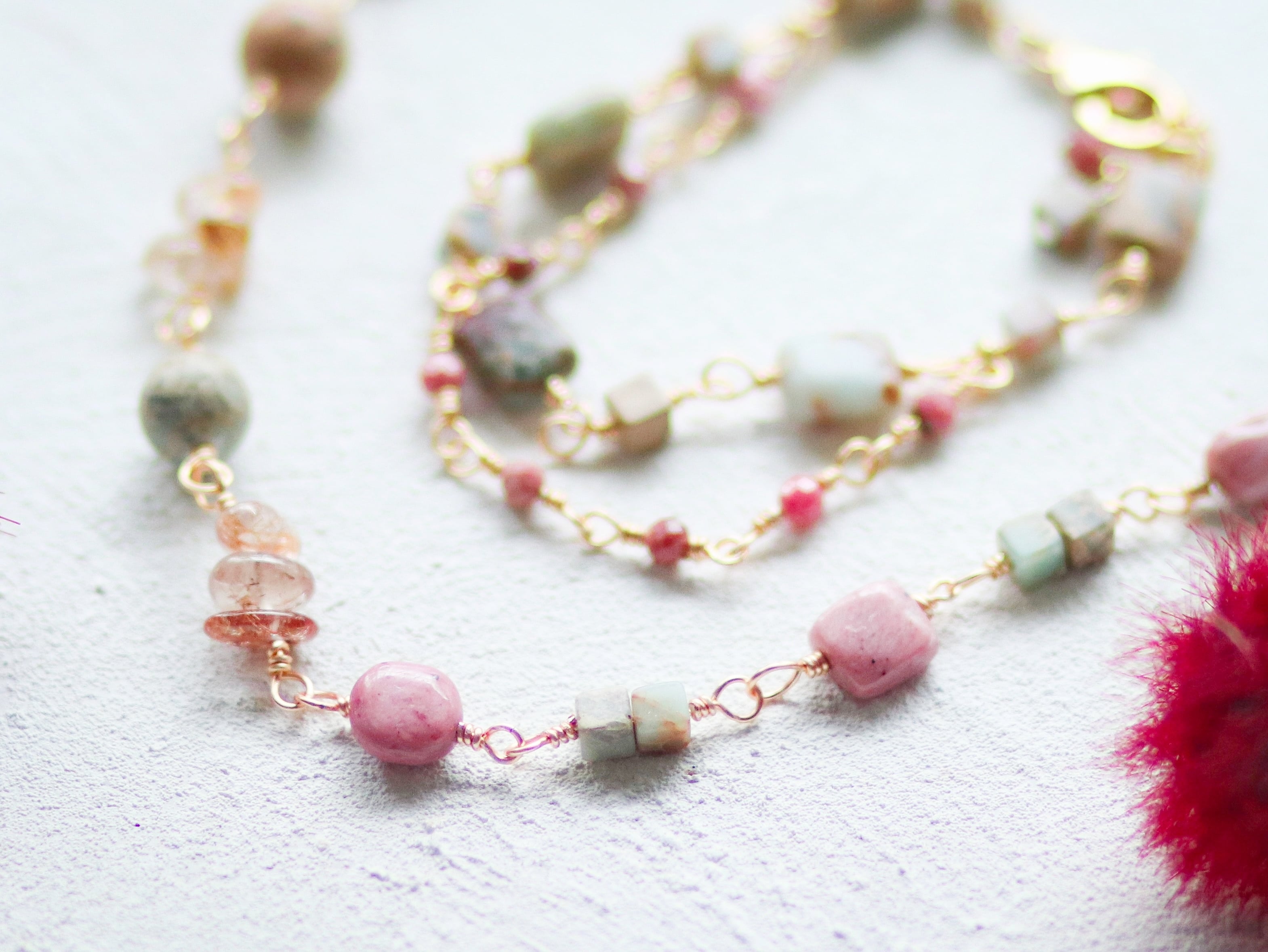 ヴィンテージ感のあるくすみカラーと、天然石の豊かな色合いが印象的な